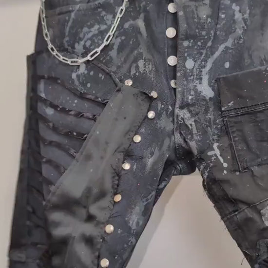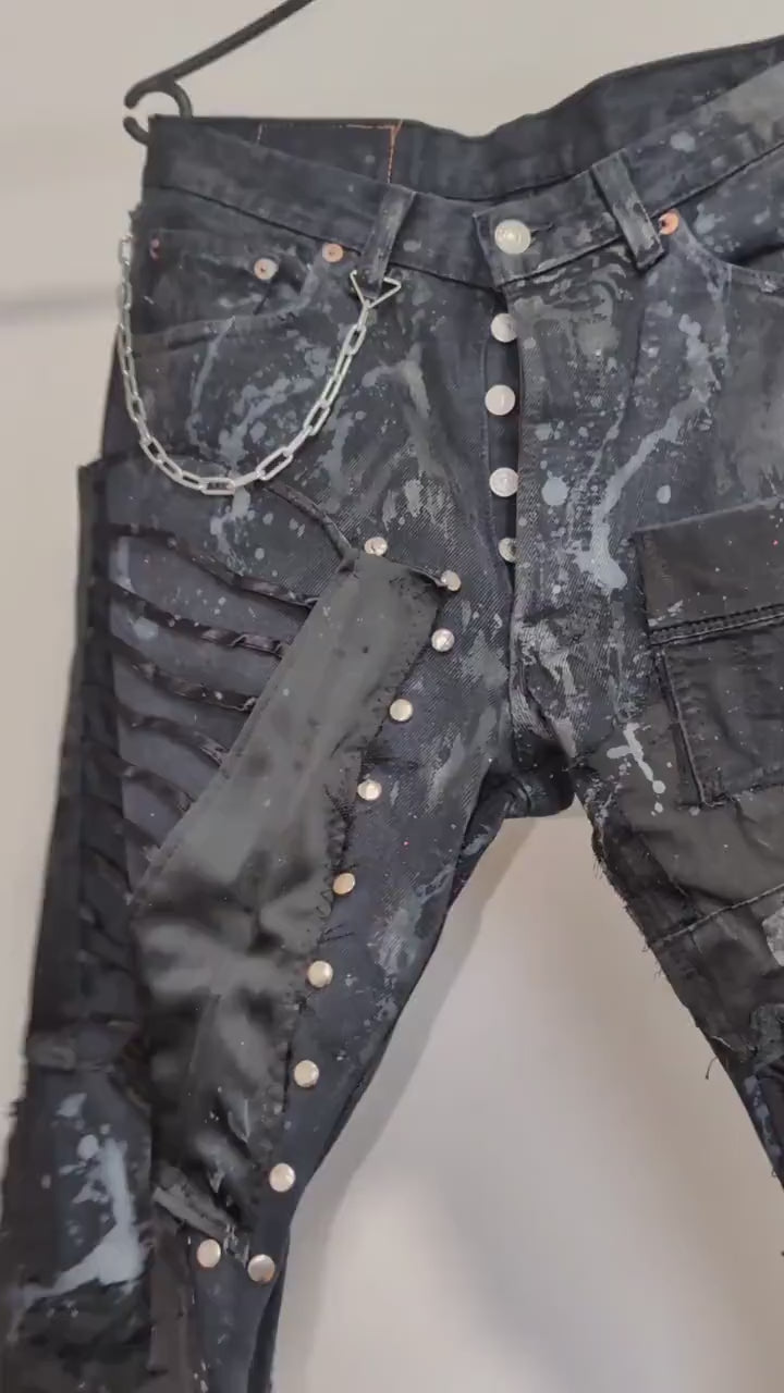 Patchworked and painted pants with various ripped materials, bucklets, eyelets, chains, zippers and rivets.