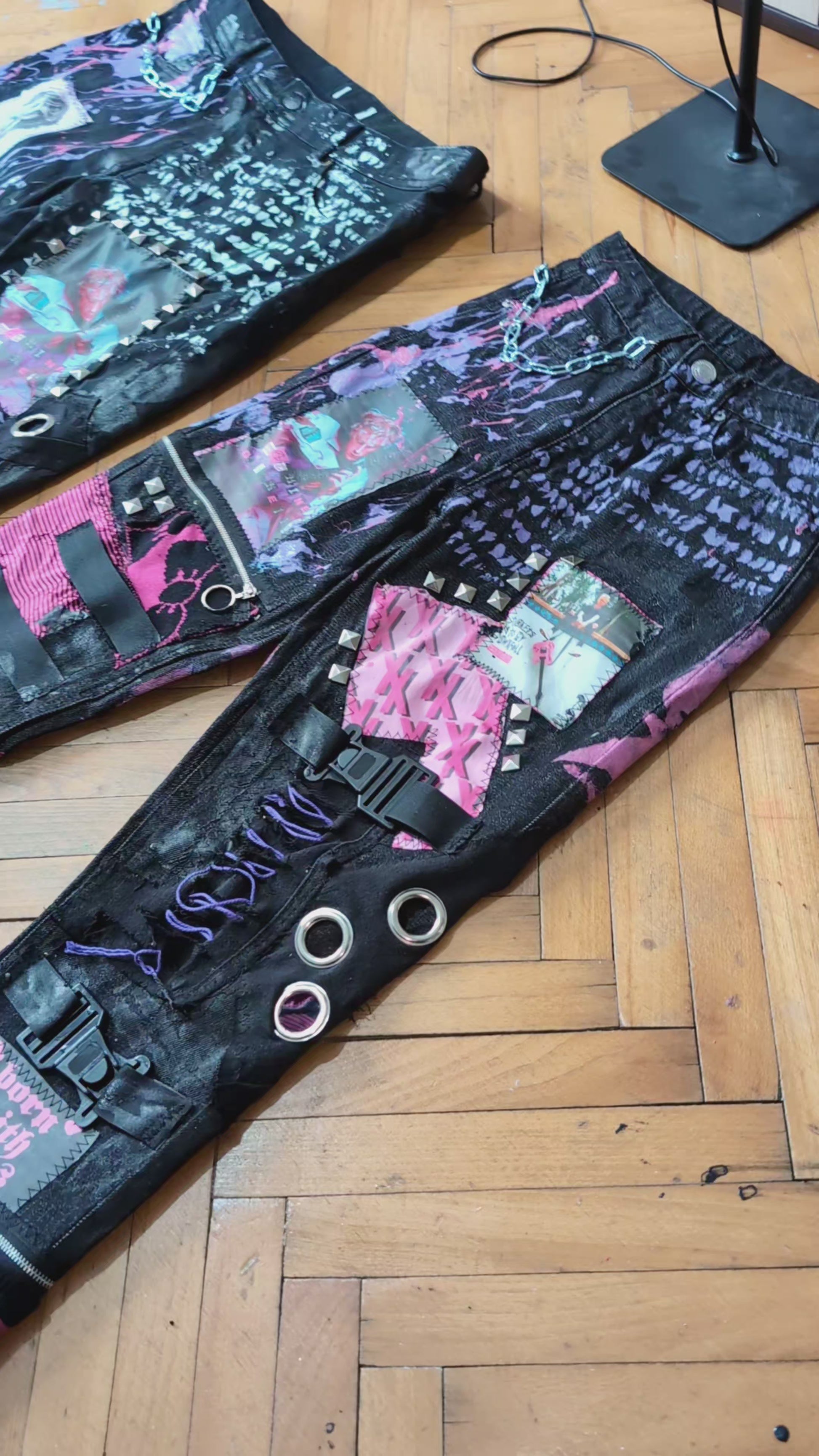 Patchworked and painted pants with chains, zippers, studs, eyelets and rivets.